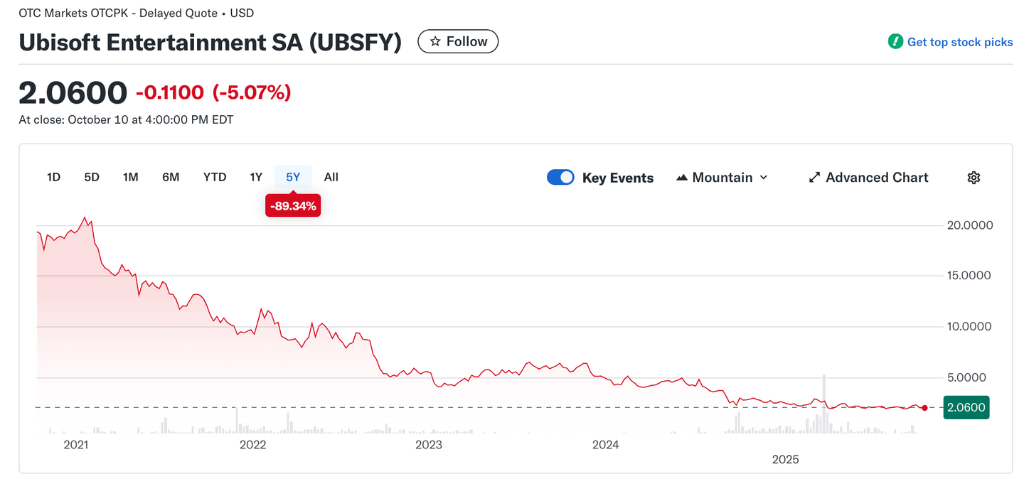 Akcie Ubisoftu se v říjnu 2025 obchodují na úrovni 2,06 USD, což představuje propad o více než 89 % za posledních pět let. Zatímco na přelomu let 2020/2021 se akcie pohybovaly kolem 20 USD, od té doby sledujeme víceméně setrvalý pokles.